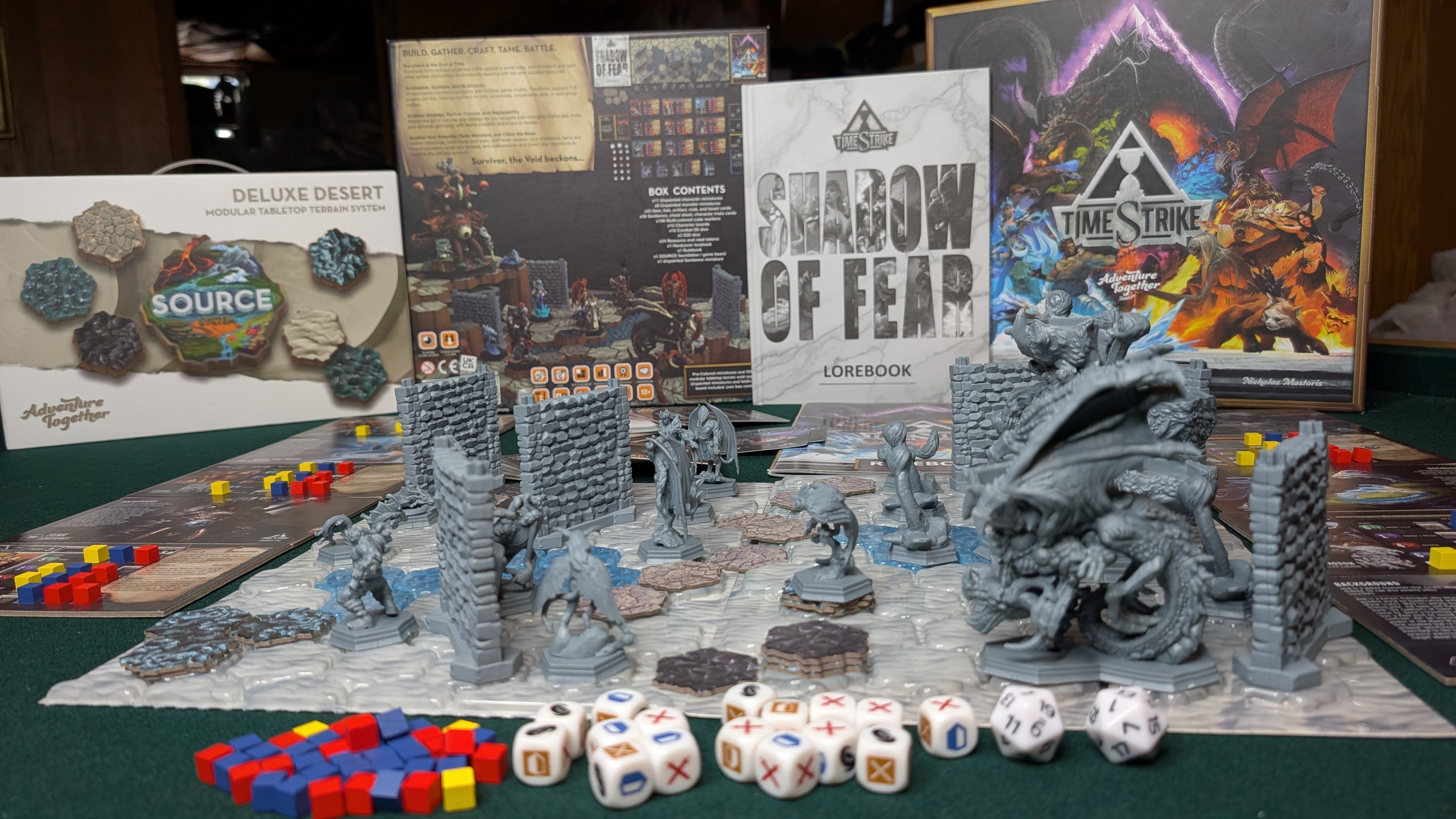 Source hexes are non-interlocking for easier placement and removal. The designs tie into gameplay mechanics, allowing for harvesting materials, building roads, destruction via massive miniatures or items, and more without extra components.